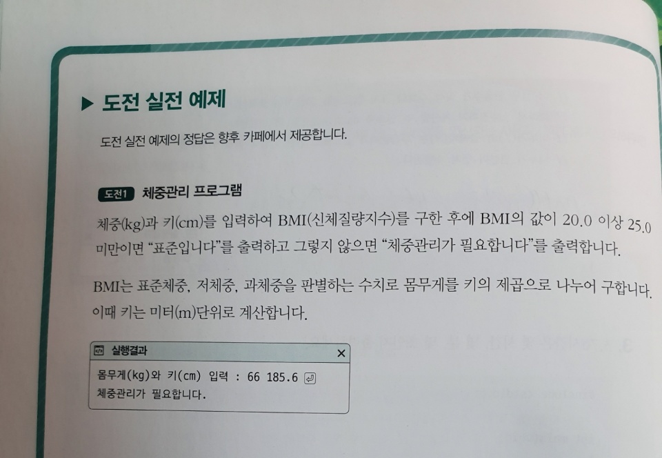 printf("몸무게(kg)와 키(cm) 입력 : "); //1